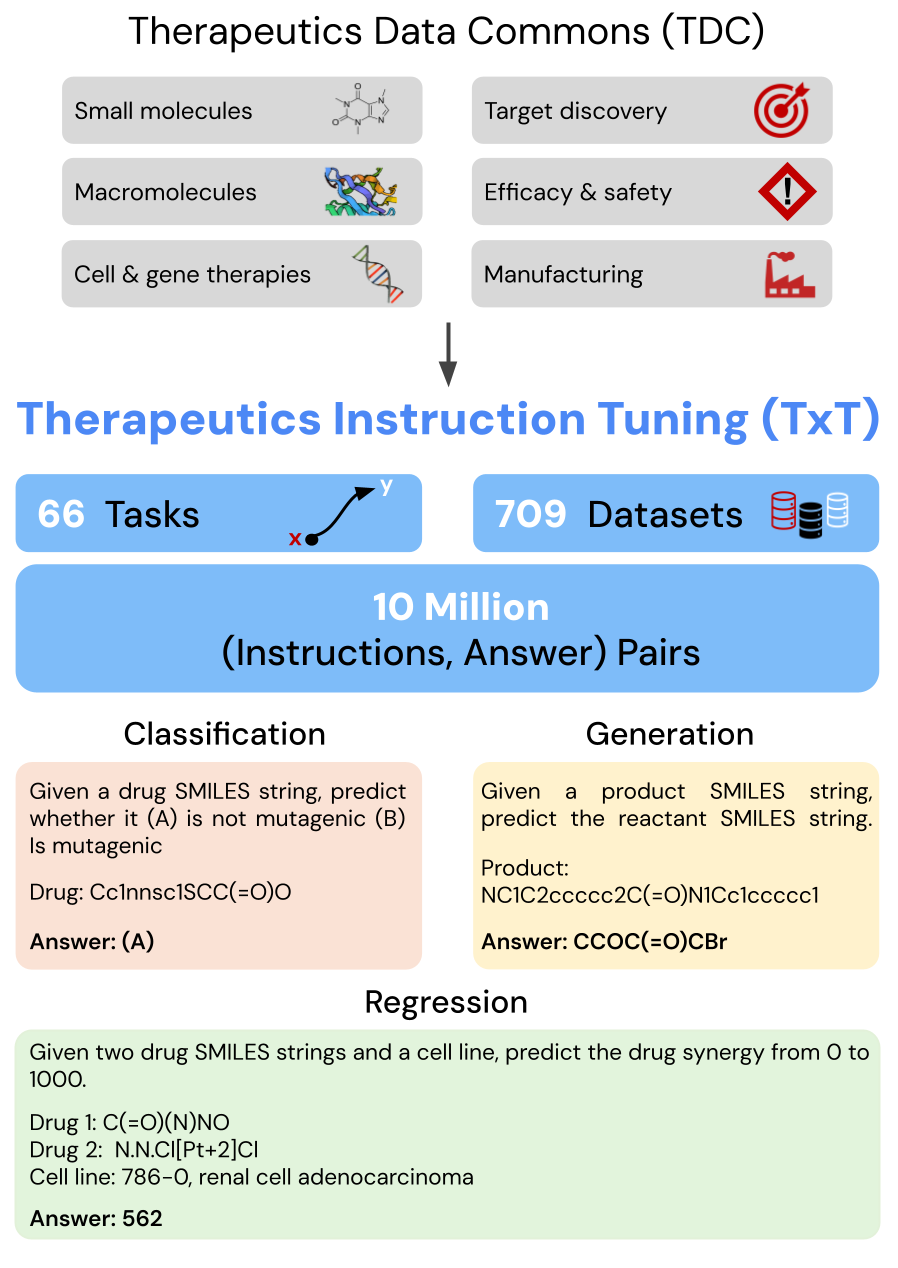 - 학습: Therapeutics Data Commons (TDC)를 포함한 66개의 다양한 신약 개발 관련 데이터셋으로 학습되었습니다.